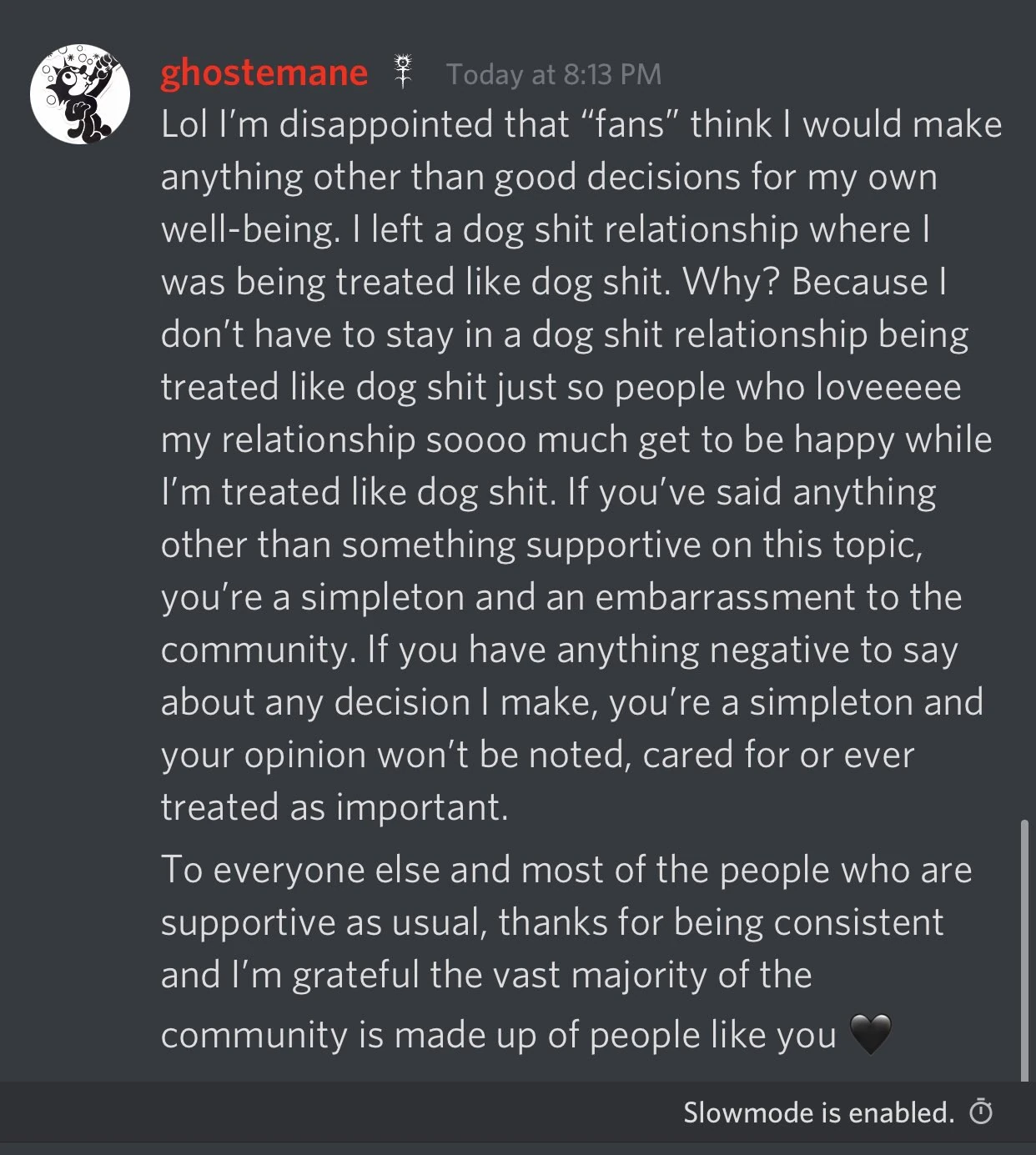 She began publicly dating American rapper Ghostemane in November 2019. In July of 2020, Ghostemane proposed to Poppy.[39] They were engaged until their separation as romantic partners in November 2021.[40]